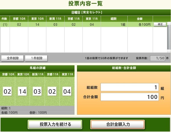 例えば、1レースと3レース5レースは自分で選び、2レース4レースはお任せにする場合は上のように「2レース」「4レース」のおまかせボタンを選びます。